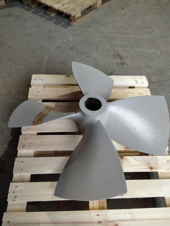 Гребной винт изготовлен по требованию заказчика из стали 25Л для эксплуатации на море. Покрыт антикорозийной краской стойкой к морской воде на эпоксидной основе. Тип Каплан для работы в насадке , четырёхлопастной, диаметр 900мм, шаг 1200 мм, дисковое отношение 0.7, масса 80 кг, имеет компромисную толщину лопасти без снижения эффективности ( КПД)