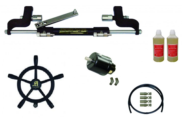 Гидравлическая рулевая система для подвесного лодочного двигателя. Управляется ручным рулевым насосом типа SOH производительностью 18, 25, 35 см.кубических соответствующей полной перекладке руля за 6,2/4,5/3,2 оборотов с гидроцилиндром OF-100. Система устанавливается на двигателя мощностью до 150 л.с.
