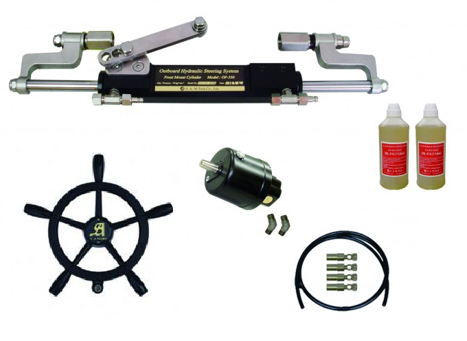 Гидравлическая рулевая система для подвесного лодочного двигателя. Управляется ручным рулевым насосом типа SOH производительностью 18, 25, 35 см.кубических соответствующей полной перекладке руля за 8.6/6.2/4.5 оборотов с гидроцилиндром OF-350. Система устанавливается на двигателя мощностью до 350 л.с.